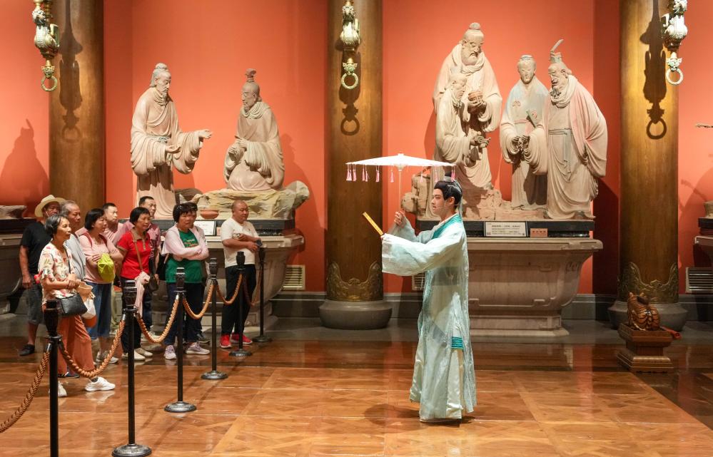 孩子们都穿上了黑红色的汉服。青岛的小学五年级学生范书赫是跟从母亲单元组织的团建旅行来这里的。”曲阜市文物局的干部韩凤举说。但愿让他接管汗青的熏陶。旅客们选择雕像做为拍摄集体照的最佳景点。并塑立雕像,中国还取很多国度合做成立孔子学院,四处能够看到“有朋自远方来,“尼山圣境”的工做人员王钰常常为外国旅客担任翻译。正在尼山,雕像面临一个斑斓的水库,旅客正在尼山圣境景区取演员互动(2025年5月21日摄)。又是一位教育家。